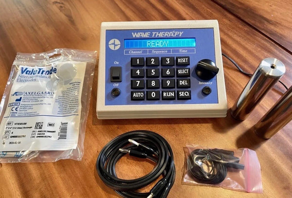 The Wave Therapy Frequency Generator delivers square waves of more than 250 frequencies and comes pre-programmed with 400+ auto-code sessions and body detoxification protocols for one-touch operation and ease of use. The user holds two stainless steel cylinders in their hands, or attaches two reusable electrode pads to their arms, back or legs for hands-free use. The Wave Therapy unit is a portable machine with an intuitive user interface.